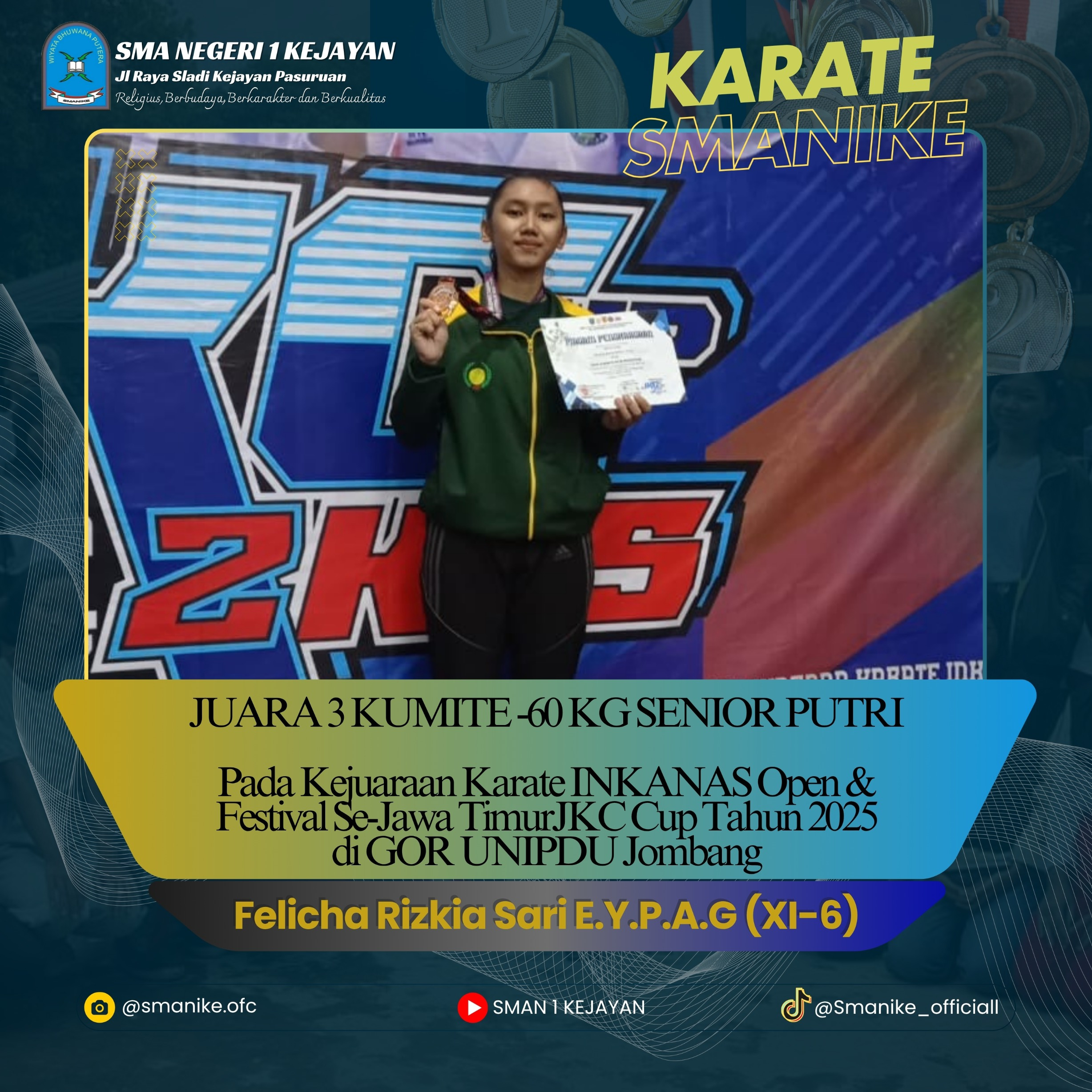 Salah satu siswa andalan SMANIKE dalam mewakilkan lomba karate yaitu Felicha Rizkia Sari lagi lagi berhasil mendapatkan prestasi di cabang lomba karate yang eventnya berada di jombang.