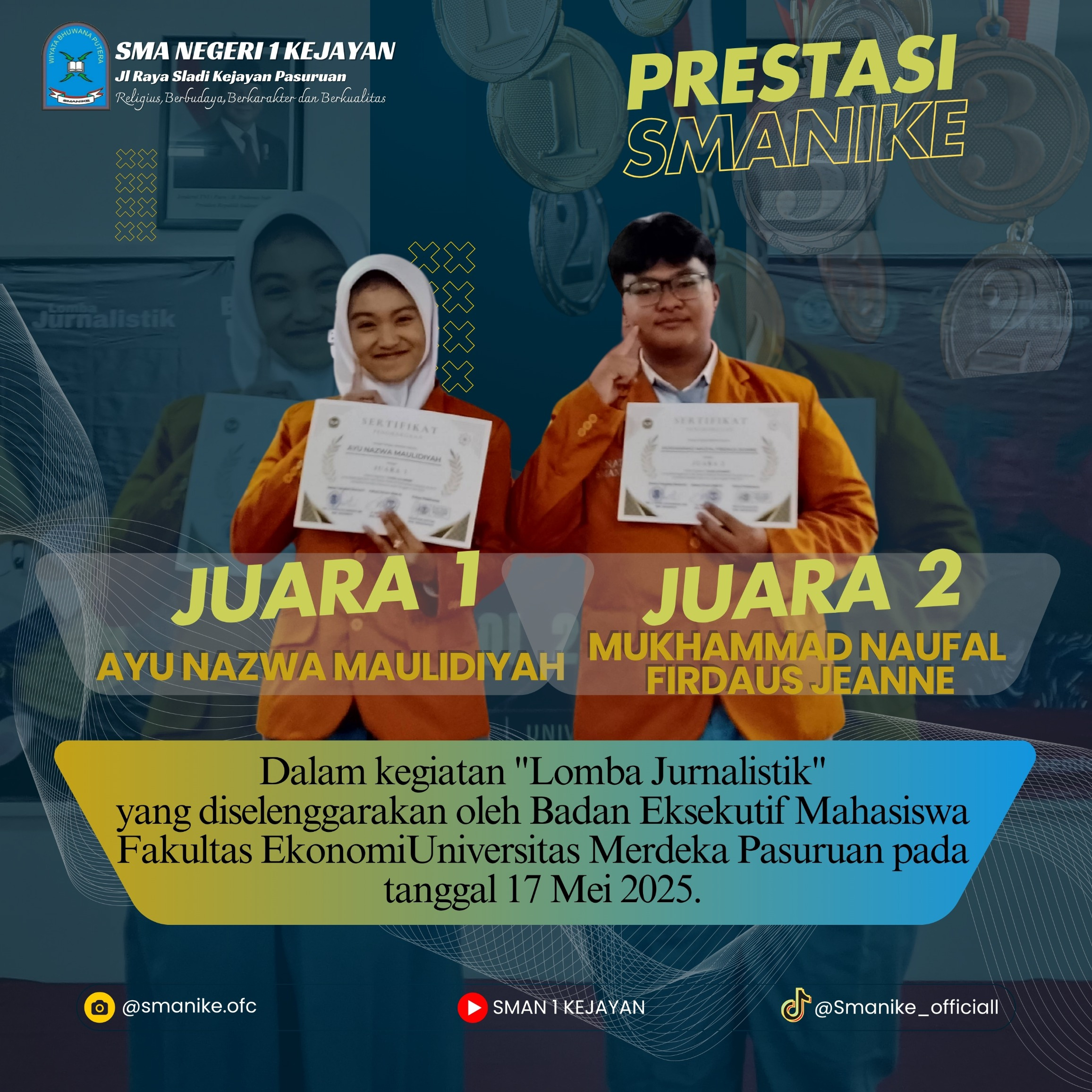 Prestasi membanggakan diraih oleh salah satu siswa kita yang berhasil meraih Juara 2 dalam lomba menulis di Universitas Merdeka Pasuruan pada 29 April. Lomba ini merupakan bagian dari kegiatan pengembangan minat dan bakat dalam bidang literasi.